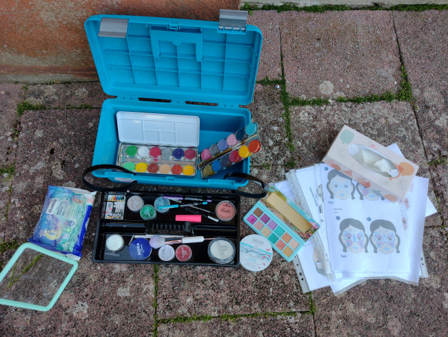Schwämmchen, Farben, Pinsel, Farbstifte, Liedschatten, Spiegel, Haareife, feuchte Tücher, Glitzerpulver, Schminkvorlagen